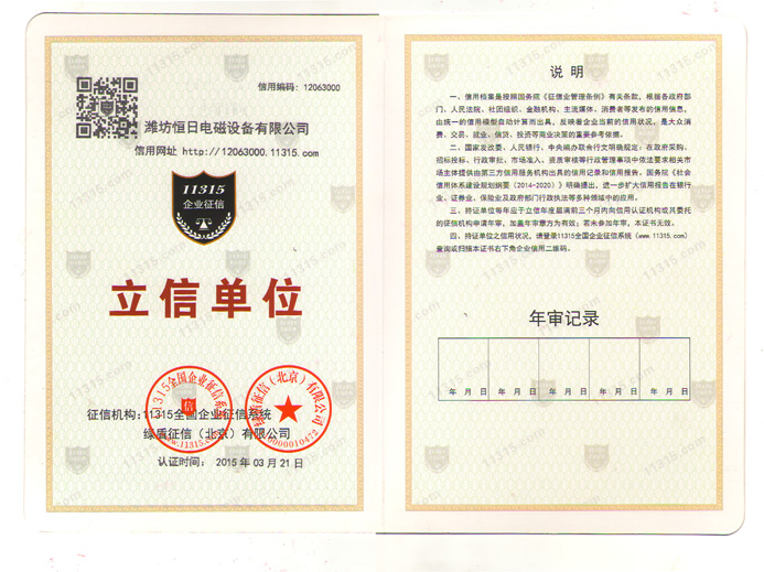 濰坊恒日電磁設備有限公司榮獲11315立信單位